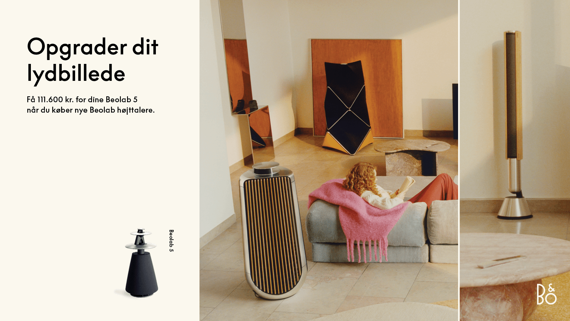 *Få 111.600 kr. for dine Beolab 5 når du opgraderer dem til et par nye Beolab 50-højttalere, to par Beolab 28-højttalere eller et par Beolab 90-højttalere. Tilbuddet gælder alle varianter og er gyldigt fra 1. oktober 2024 til 31. december 2024 i deltagende Bang & Olufsen butikker. Tilbuddet kan ikke overføres til kontantrabat eller kombineres med andre kampagnetilbud. Prisen er ekskl. installation.